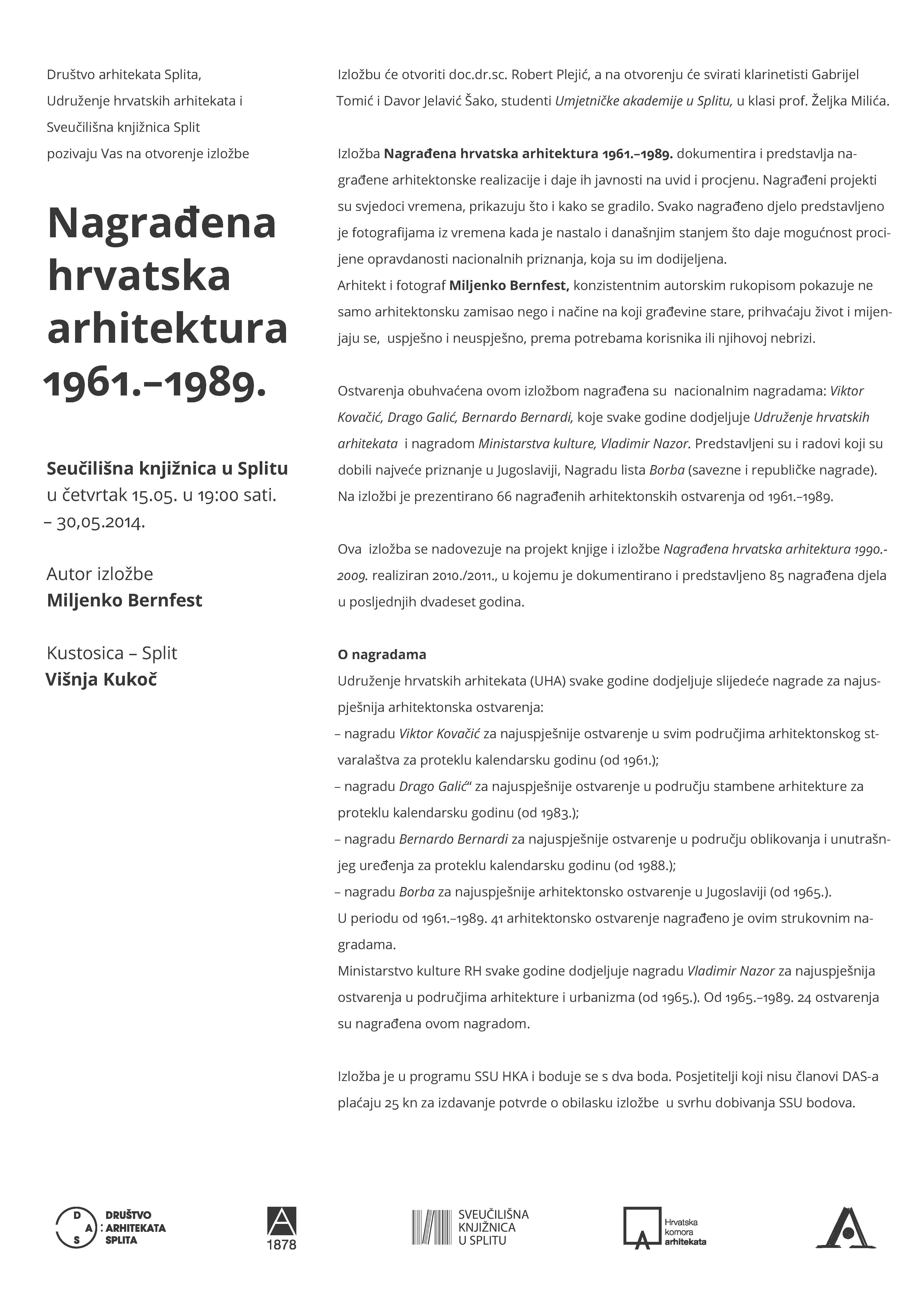 Izložba Nagrađena hrvatska arhitektura 1961.–1989. dokumentira i predstavlja nagrađene arhitektonske realizacije i daje ih javnosti na uvid i procjenu. Nagrađeni projekti su svjedoci vremena, prikazuju što i kako se gradilo. Svako nagrađeno djelo predstavljeno je fotografijama iz vremena kada je nastalo i današnjim stanjem što daje mogućnost procjene opravdanosti nacionalnih priznanja, koja su im dodijeljena.