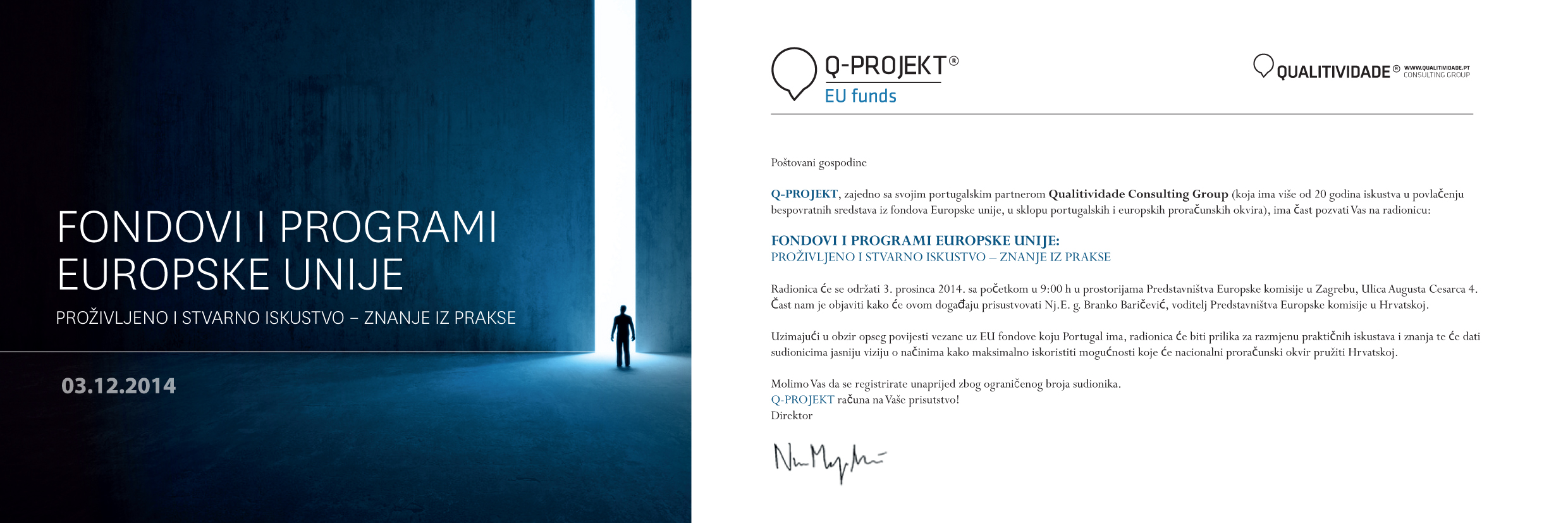 Radionicu organizira Q-PROJEKT, zajedno sa svojim portugalskim partnerom QUALITIVIDADE CONSULTING GROUP (koja ima više od 20 godina iskustva u povlačenju bespovratnih sredstava iz fondova Europske unije, u sklopu portugalskih i europskih proračunskih okvira).