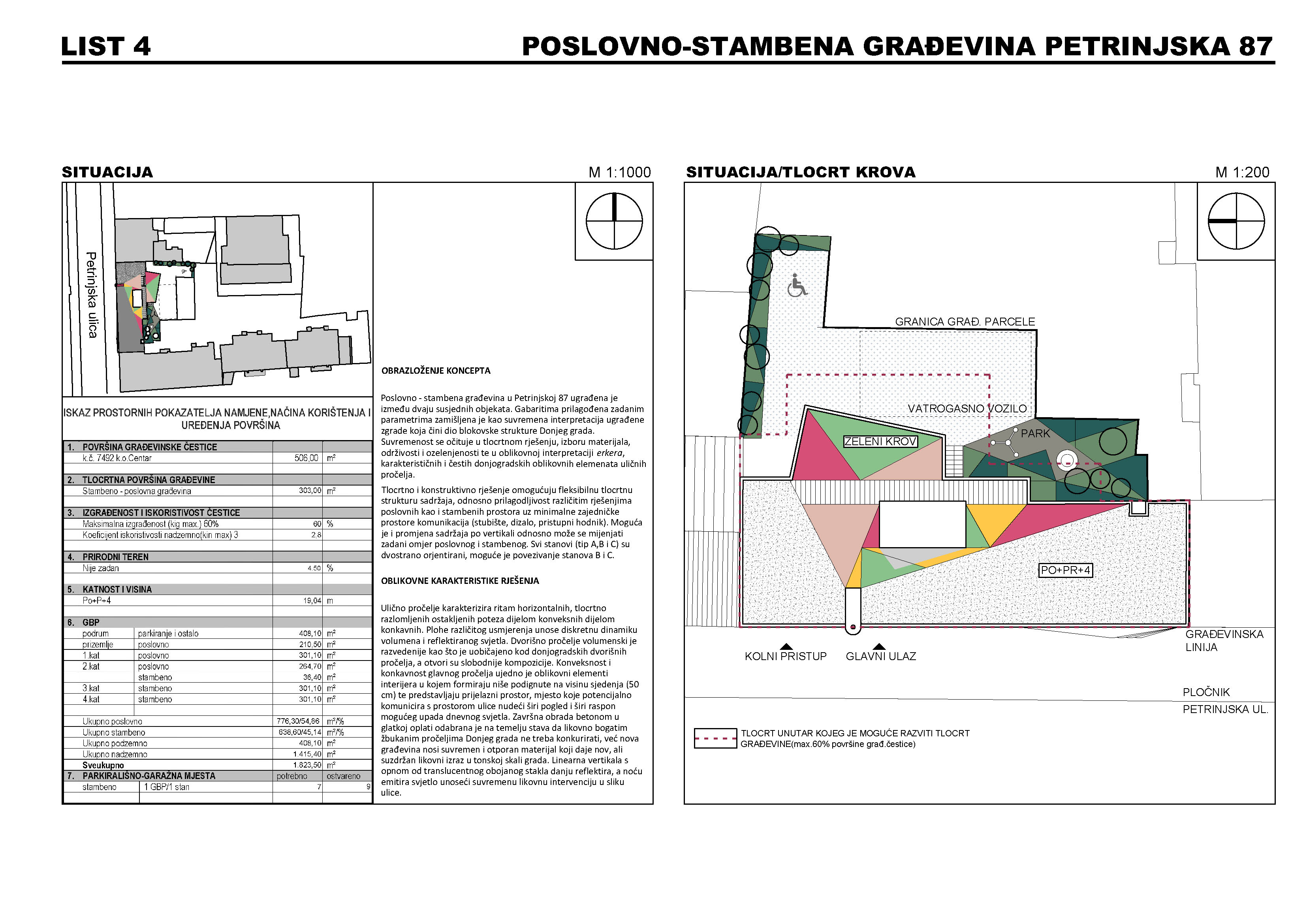 natječaja bio je dobivanje najboljeg idejnog arhitektonskog rješenja temeljem kojeg će se izraditi daljnji potrebni projekti za uređenje prostora i izgradnju poslovno stambene građevine na lokaciji Petrinjska 87, Zagreb, k.č. 7492 k.o. Centar.