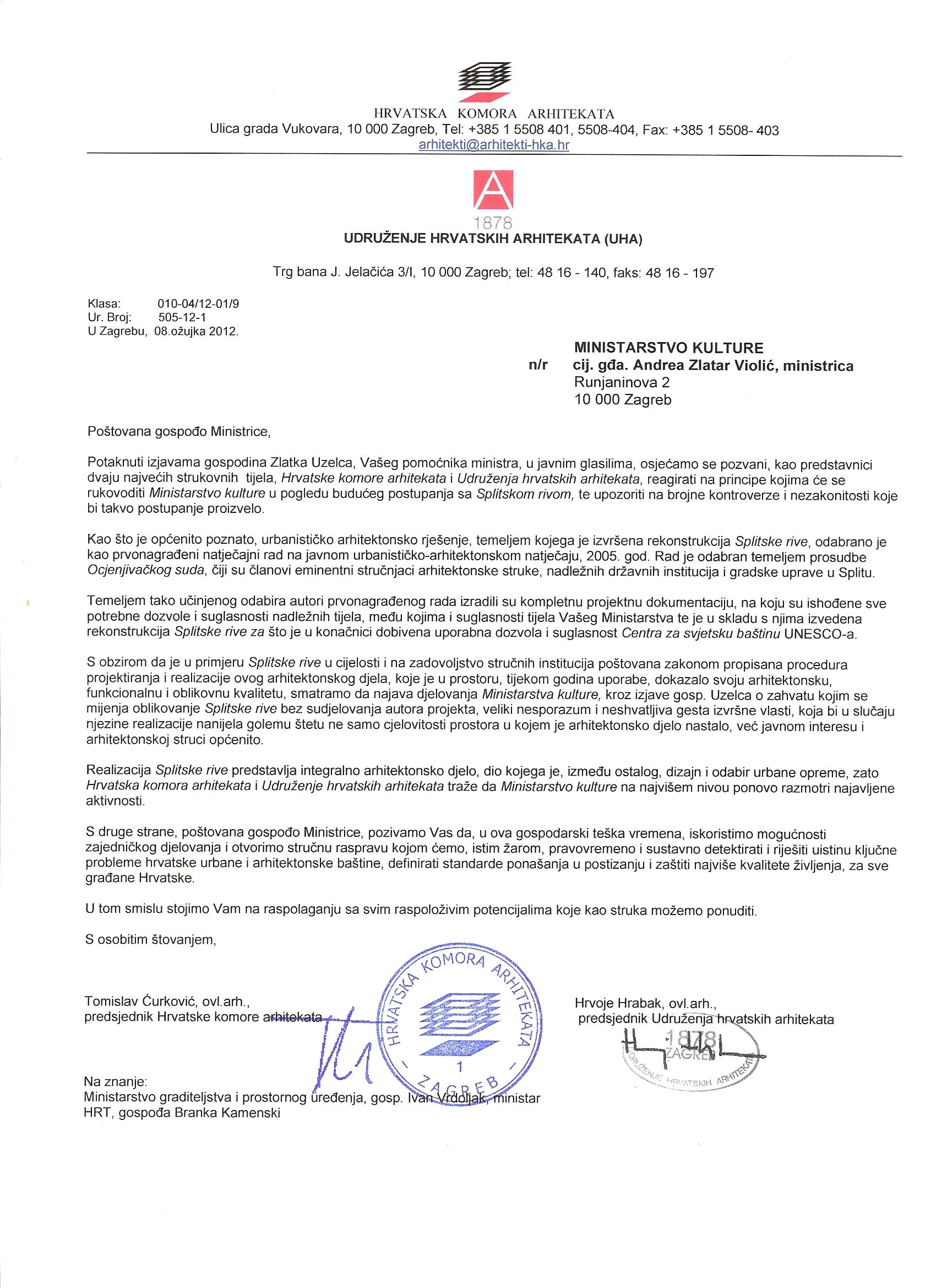 Hrvatska komora arhitekata i Udruženje hrvatskih arhitekata uputili su dopis Ministrici kulture
