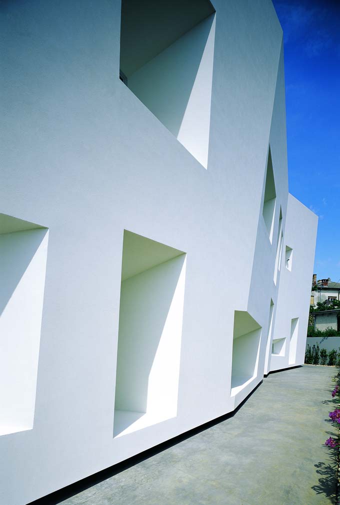 Činjenica da je kuća projektirana za dizajnera rasvjete očita je već u tretmanu volumena, tj. naglašenim distorzijama vanjskog plašta i prozorskih otvora. Korištenjem pročelja kao medija za igru svjetlom (prirodno i umjetno) kuća je postala svojevrsni billboard za poslovnu prezentaciju investitora.