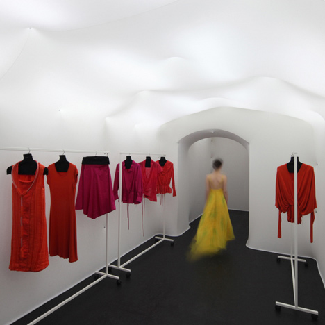 Unutar čvrste postojeće stukture prostor je oblikovan elastičnom opnom krojenom od rastezljive prozračne tkanine točkasto sidrene u strukturu zida i svoda građevine, a postavom fluo cijevi iza translucentne opne omogućeno je difuzno i ravnomjerno osvjetljenje. Nizanjem mekih, zaobljenih ploha proizašlih iz specifičnosti materijala i načina učvršćenja, nastala je neovisna struktura i dinamika forme stvarajući fluidan prostor jednostavne ljepote. Čvrsta ploha od crnog platna koja uokviruje ulaz kontrast je bijeloj mekoći unutrašnjosti te označava mjesto i gradi odnos prema postojećem urbanom potezu ulice.