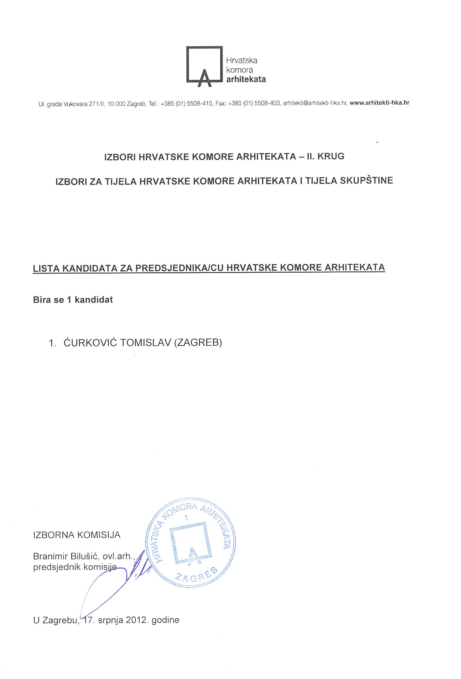 Sukladno čl. 22. Pravilnika o izborima objavljujemo životopis i program rada kandidata za predsjednika. Izborna sjednica Skupštine održat će se 20. srpnja 2012. godine, na kojoj će se birati tijela Hrvatske komore arhitekata i tijela Skupštine.