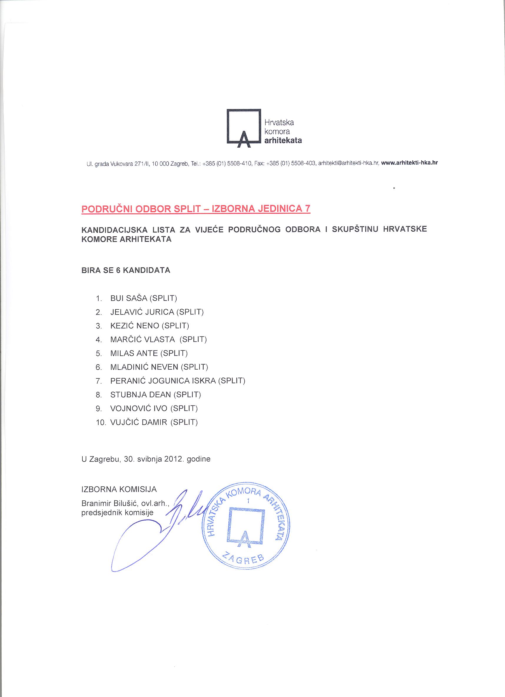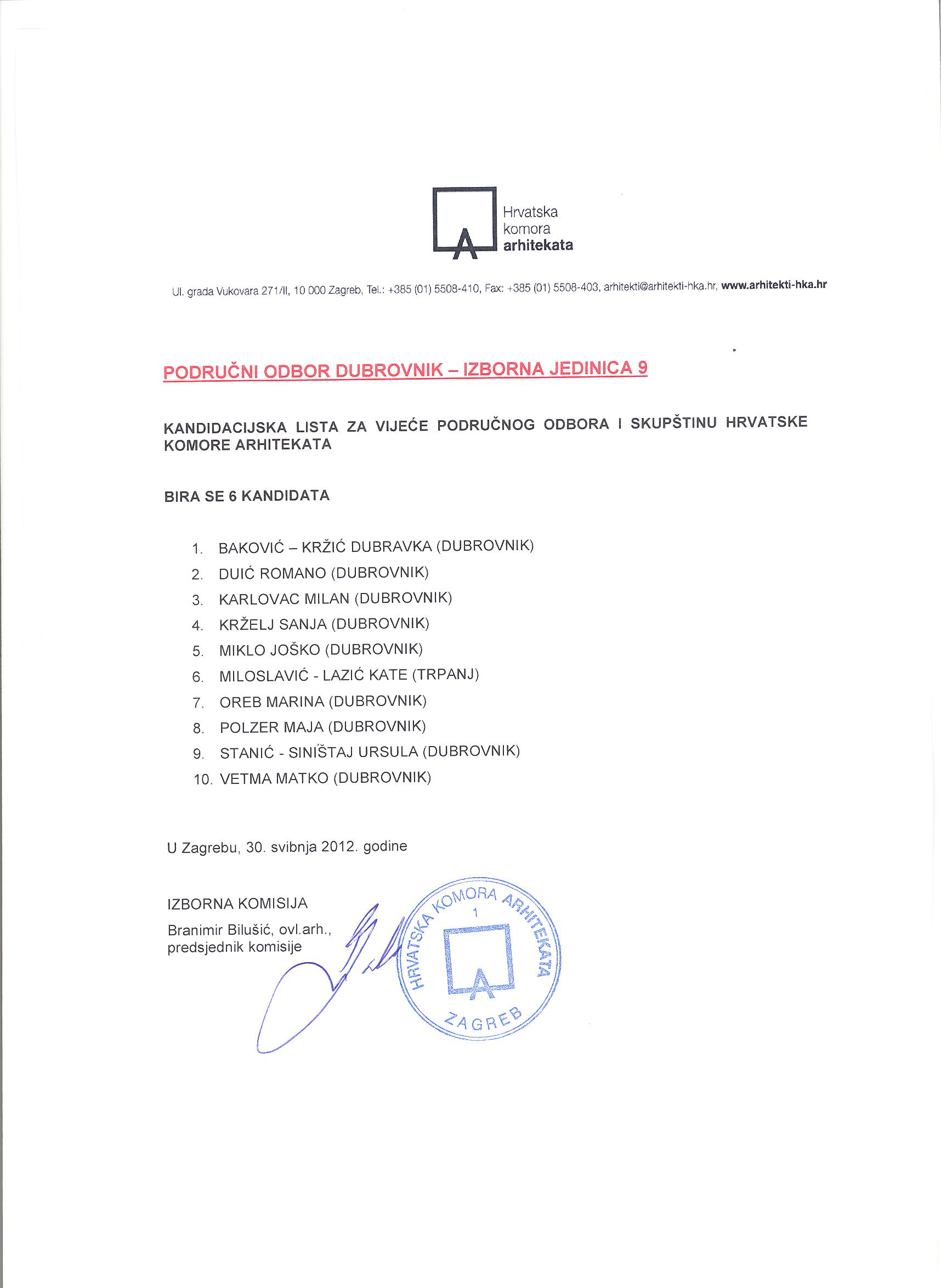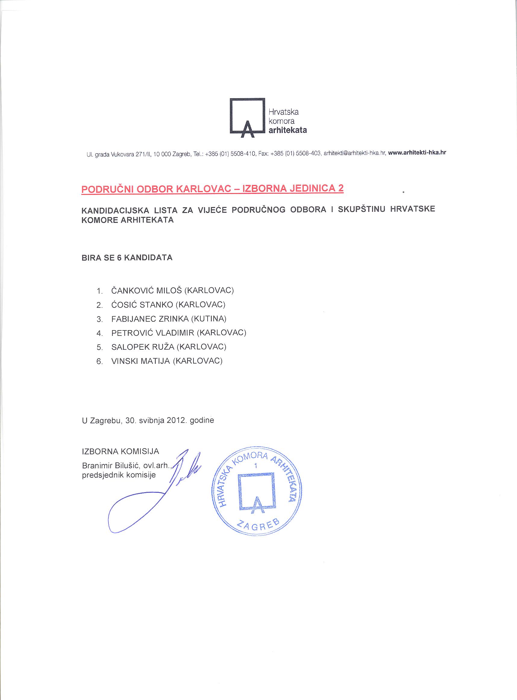 na temelju članka 36. st. 6. Statuta Hrvatske komore arhitekata ("Narodne novine", br. 131/10, pročišćeni tekst) i članka 11. st. 2. Pravilnika o izborima HKA, Izborna komisija objavljuje kandidacijske liste za Vijeća Područnih odbora i Skupštinu Hrvatske komore arhitekata: