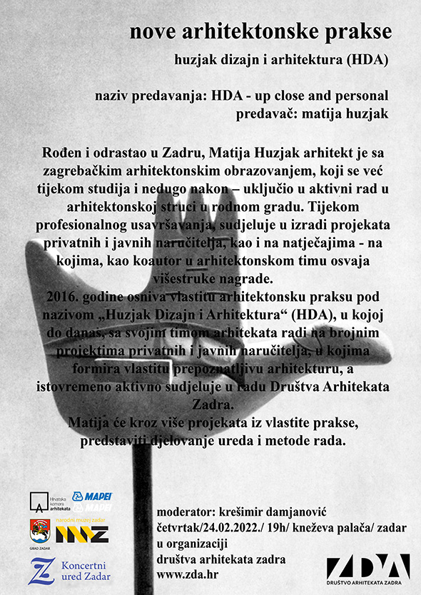 Matija Huzjak / Huzjak dizajn arhitektura / Up close and personal / predavanje u Zadru, četvrtak 24.2.2022. u 19 sati, uz virtualni prijenos