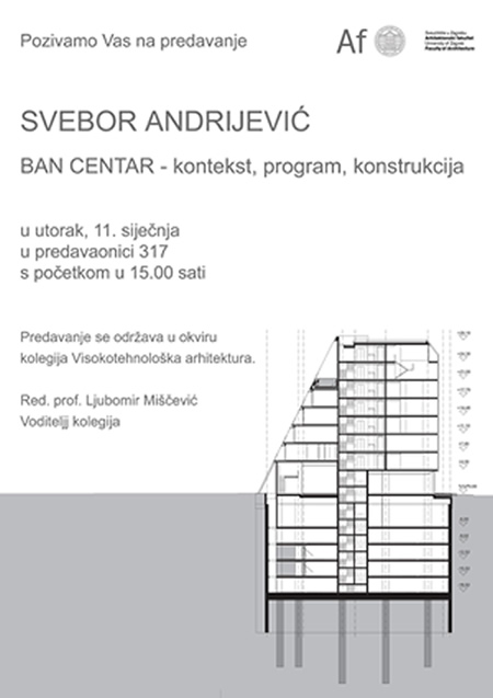 BAN CENTAR - kontekst, program, konstrukcija - predavanje se održava u okviru kolegija Visokotehnološka arhitektura gdje je prof. Ljubomir Miščević voditelj kolegija.
