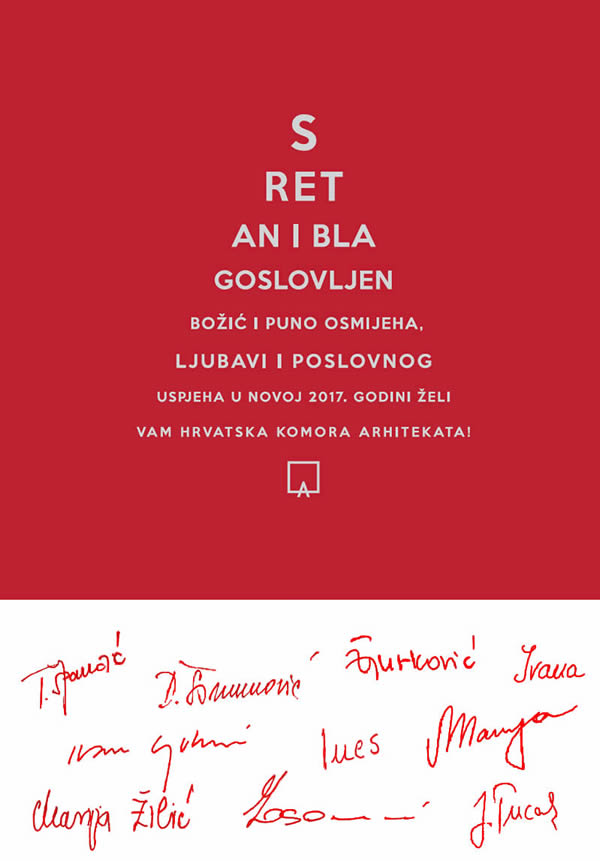 I na kraju ovog dugog pisma želim Vam u svoje osobno ime, u ime Upravnog odbora HKA-a i u ime Tajništva HKA-a da se u društvu obitelji i prijatelja ovih blagdanskih dana odmorite te da svi skupa u 2017. godini nastavimo raditi za dobrobit arhitektonske profesije i arhitekata u Hrvatskoj.
