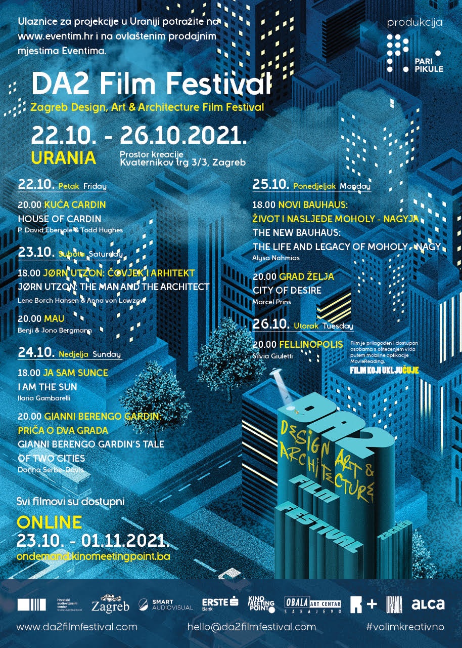 Treće izdanje DA2 – Zagreb Design, Art & Architecture Film Festivala će se održati od 22. do 26. listopada u zagrebačkoj Uraniji – prostoru kreacije i od 23.listopada do 1.studenog 2021. online putem platforme ondemand.kinomeetingpoint.ba