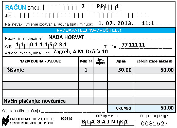 podatke o izdavatelju (naziv radnje, adresu i osobni identifikacijski broj vlasnika),