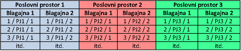 Poduzeće koje se bavi trgovinom ima 3 dućana. Poslovni prostori su određeni kao PJ1, PJ2 i PJ3. U svakom poslovnom prostoru postoje 2 blagajne koje su označene brojevima 1, 2.