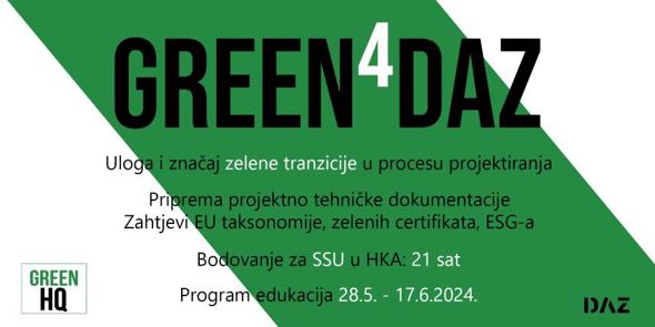 GREEN4DAZ - uloga i značaj zelene tranzicije u procesu projektiranja / program edukacija, DAZ Zagreb, 28.5. - 17.6.2024.