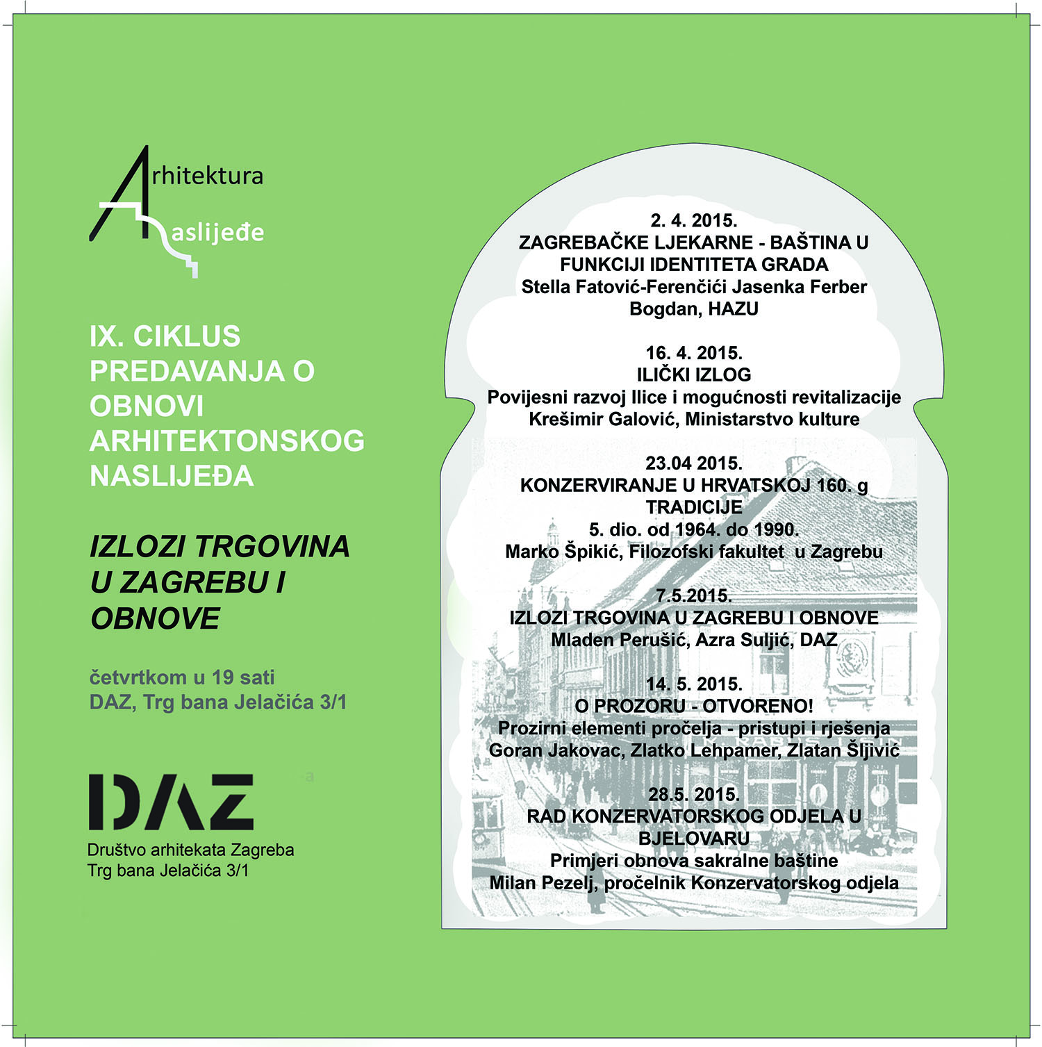 Društvo arhitekata Zagreba poziva Vas na predavanje iz IX ciklusa Arhitektura i naslijeđe - Konzerviranje u Hrvatskoj 160 godina tradicije - 5. dio od 1964. do 1990.godine koje će održati povjesničar umjetnosti dr. sc. Marko Špikić , u četvrtak 23. travnja 2015. u 19 sati u prostorijama DAZ-a, Trg bana Josipa Jelačića 3/1. Predavanje je uvršteno u Sustav stručnog usavršavanja Hrvatske komore arhitekata i boduje se s 3 (tri) boda.