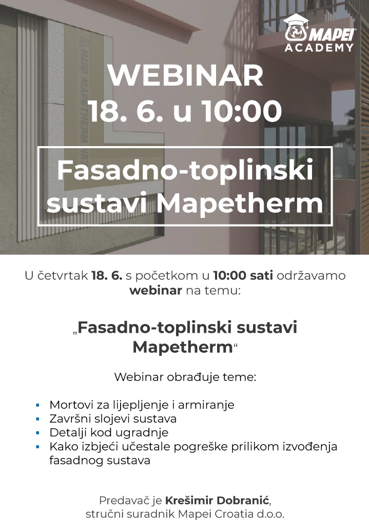 Hrvatska komora arhitekata u Programu stručnog usavršavanja najavljuje novi Mapei webinar koji se vreduje s jednim (1) satom.