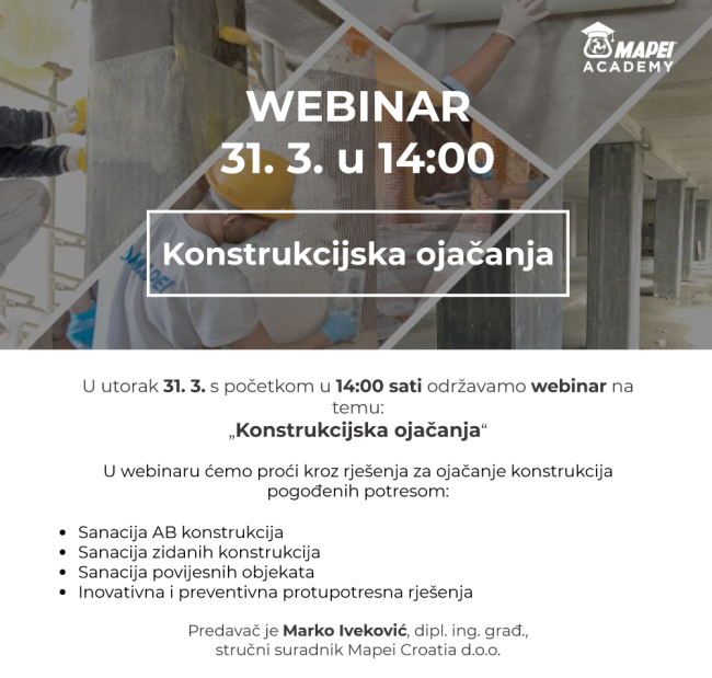 najavljuje drugi webinar tvrtke Mapei Konstrukcijska ojačanja u utorak, 31.3.2020. u 14,00 sati!