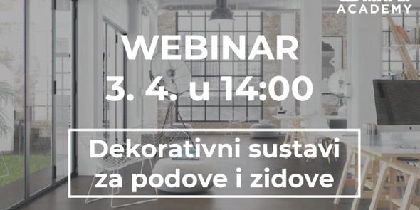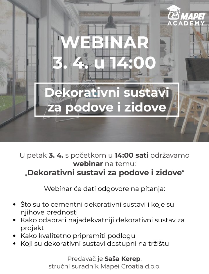najavljuje treći webinar tvrtke Mapei Dekorativni sustavi za podove i zidove u petak, 3.4.2020. u 14,00 sati!