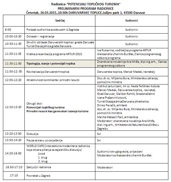 Pred nama je druga radionica koja će se održati 26.03.2015. u Daruvarskim toplicama pod nazivom "Potencijali topličkog turizma" koja će se baviti prirodnim resursima kao generatorima potražnje i osnovom turističke ponude.