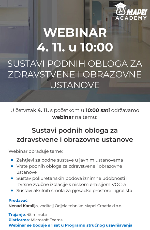 Sustavi podnih obloga za zdravstvene i obrazovne ustanove - MAPEI webinar / 4.11.2021. u 10 sati