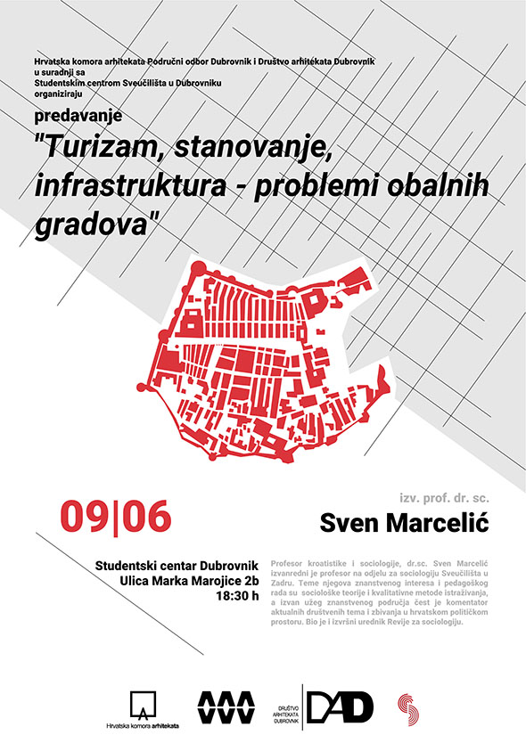 Hrvatska komora arhitekata – Područni odbor Dubrovnik, Društvo arhitekata Dubrovnika i Studentski centar Sveučilišta u Dubrovnika pozivaju Vas na 4. predavanje u ciklusu „Grad kao mjera“ pod nazivom „TURIZAM, STANOVANJE, INFRASTRUKTURA – problemi obalnih gradova“.