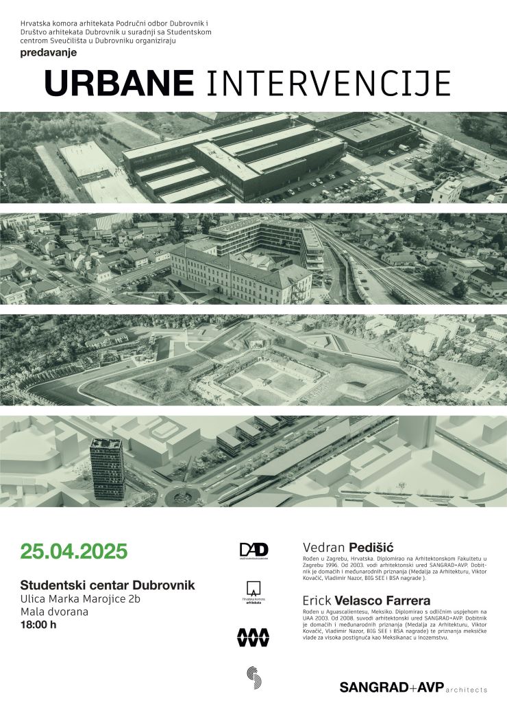 Hrvatska komora arhitekata – Područni odbor Dubrovnik, Društvo arhitekata Dubrovnika i Studentski centar Sveučilišta u Dubrovnika pozivaju Vas na predavanje koje su pripremilil Vedran Pedišić i Erick Velasco Farrera (SANGRAD+AVP architects).